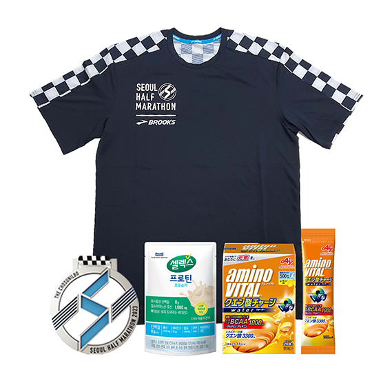 완주자 기념 메달을 드립니다. 티셔츠도 드립니다. 아미노바이탈 구연산 워터를 증정합니다. 아미노바이탈 구연산 워터는 완주했을 때 지급됩니다. 셀렉스 프로틴 로우슈거를 간식과 함께 지급합니다.